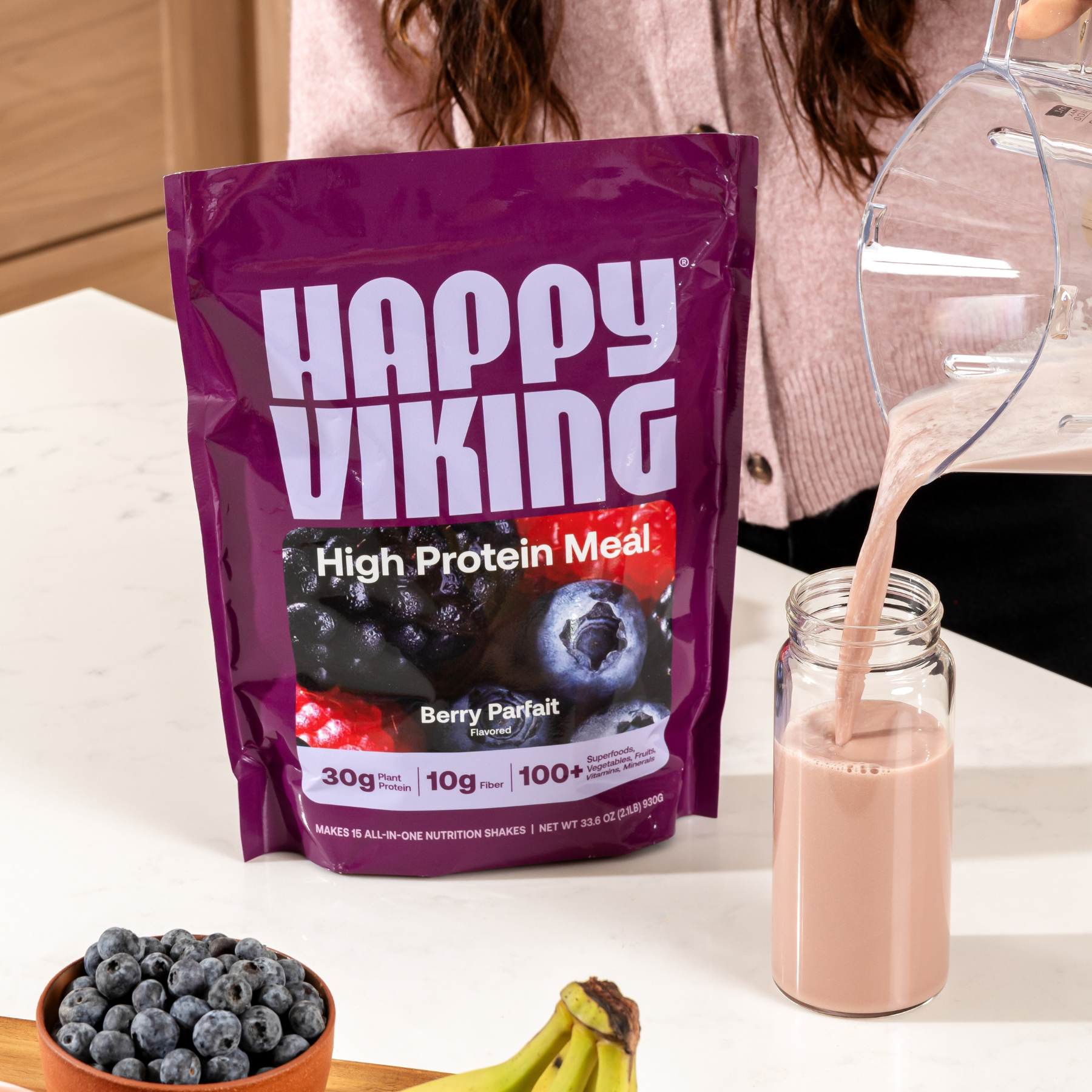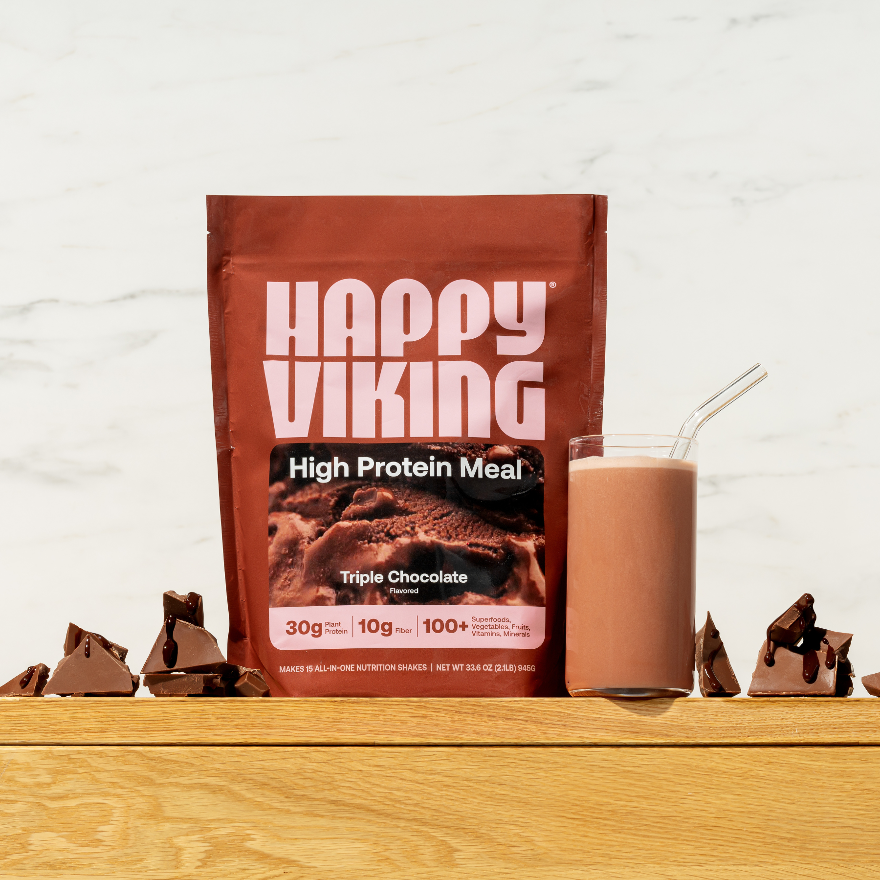 Many shakes only give you protein. Happy Viking fuels your whole body with protein, fiber, healthy fats, vitamins, minerals, and superfoods, the nutrition of a complete meal in every scoop.