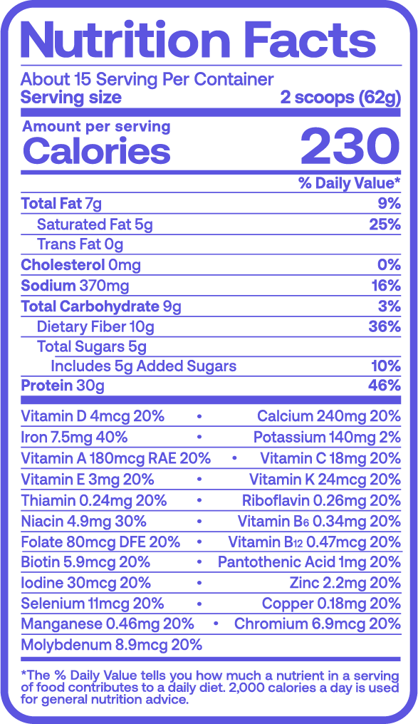 HV Protein Blend (Yellow Pea & Brown Rice), Soluble Fiber (acacia), MCT Oil (Coconut), Cane Sugar, Cocoa Powder (alkalized), Natural Flavor, Moro Red Orange Extract, KSM-66 Ashwagandha Root Extract, Organic Guar Gum, Xanthan Gum, Sea Salt, Reb M, Nutrients Extracted From (Broccoli, Spinach, Kale, Pumpkin, Sweet Potato, Sunflower Seed, Cranberry, Chlorella, Maitake Mushroom, Shiitake Mushroom), Superfood, Fruit, & Vegetable Blend (Pomegranate Extract, Okra, Asparagus, Coffee Berry Extract, Quercetin, Acerola and Acerola Extract, Camu Camu and Camu Camu Concentrate, Acai and Acai Concentrate, Mangosteen and Mangosteen Concentrate, Pumpkin, Banana, Dragon fruit, Lemon Peel, Mango, Maqui, Orange Peel, Pineapple, Blackberry and Blackberry Concentrate, Kiwi, Peach, Apple and Apple Extract, Aronia, Goji Juice Concentrate, Pear, Plum, Alfalfa, Barley Grass, Broccoli Head and Broccoli Head Concentrate, Cabbage, Cauliflower, Celery, Cilantro, Green Onion, Purslane, Red Pepper, Spirulina, Turmeric and Turmeric Concentrate, Zucchini, Beet, Sweet Potato, Basil, Chlorella, Collard Greens, Pea, Broccoli Sprout and Broccoli Sprout Concentrate, Onion Extract, Tomato and Tomato Concentrate, Carrot and Carrot Concentrate, Spinach and Spinach Concentrate, Kale and Kale Concentrate, Brussel Sprouts and Brussel Sprout Concentrate, Grape and Grape Seed Extract, Wild Blueberry and Wild Blueberry Extract, Raspberry and Raspberry Seed Concentrate, Cranberry, Prune, Tart Cherry, Wild Bilberry and Wild Bilberry Extract, Strawberry, Coffee Arabica Extract, Green Tea Extract, Garlic Concentrate, Oregano Concentrate, Cinnamon Concentrate, Elderberry Concentrate, Blackcurrant Concentrate, Sweet Cherry Concentrate, Chokeberry Concentrate), Ancient Grains Blend (Organic Amaranth, Organic Quinoa, Organic Buckwheat, Organic Millet, Organic Chia), Bifidobacterium lactis (probiotic), Lacticaseibacillus rhamnosus (probiotic)